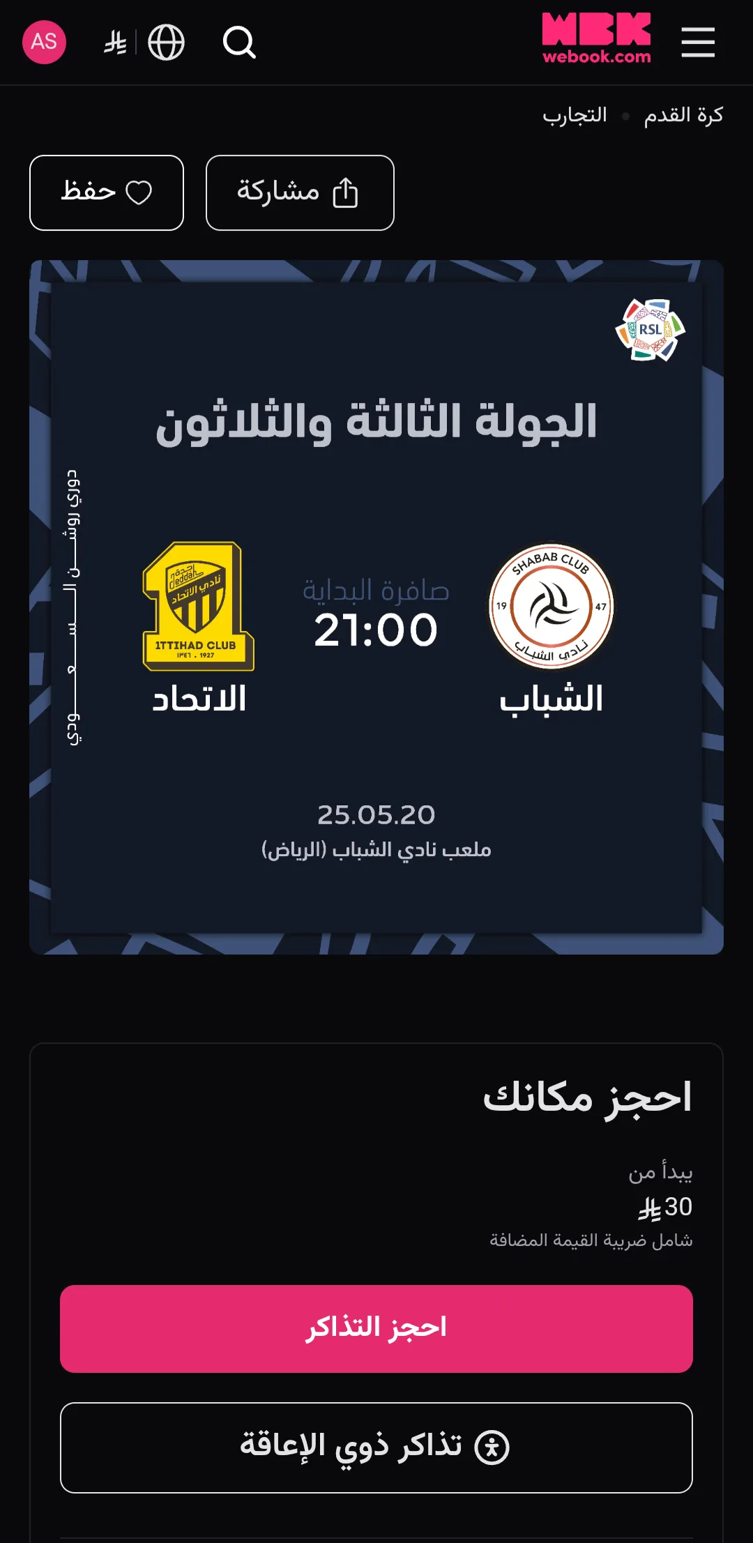 - الخطوة الأولى: يجب النقر على رابط حجز تذاكر مباراة الشباب والاتحاد.
